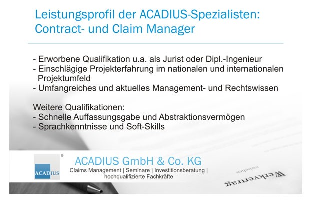 Als langjährige Dienstleisterin im Bereich Contract- und Claim Management verfügt die Acadius über Spezialisten mit langjähriger Erfahrung im In- und Ausland. Bei ACADIUS-Spezialisten handelt es sich um qualifizierte, mehrsprachige Fachleute mit einem aktuellen Fachwissen. In erster Linie handelt es sich um Juristen und Dipl.-Ingenieure.
